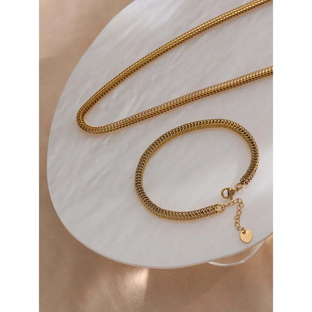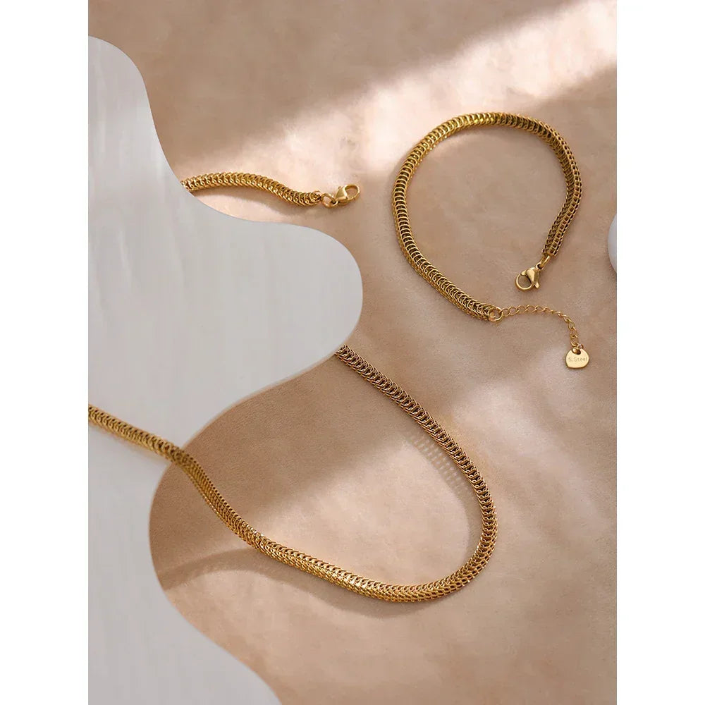 We forge this set from premium 316L stainless steel, known for its superior corrosion resistance. The luxurious gold plating is meticulously applied to last. Each substantial link and secure clasp is polished to perfection, ensuring a set built for a lifetime of wear.