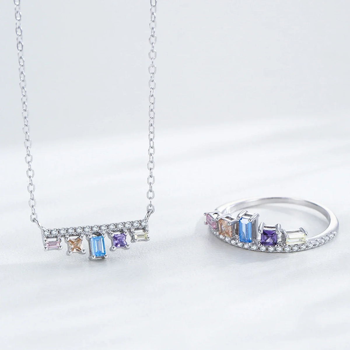 Illuminate your style with the Lustrous Gem Spectrum Set, a dazzling combination of multicolored geometric zircon stones set in premium 925 sterling silver. Designed to captivate, this set adds vibrant elegance to any occasion. Whether for a wedding, anniversary, or a personal treat, let its brilliance enhance your every moment.