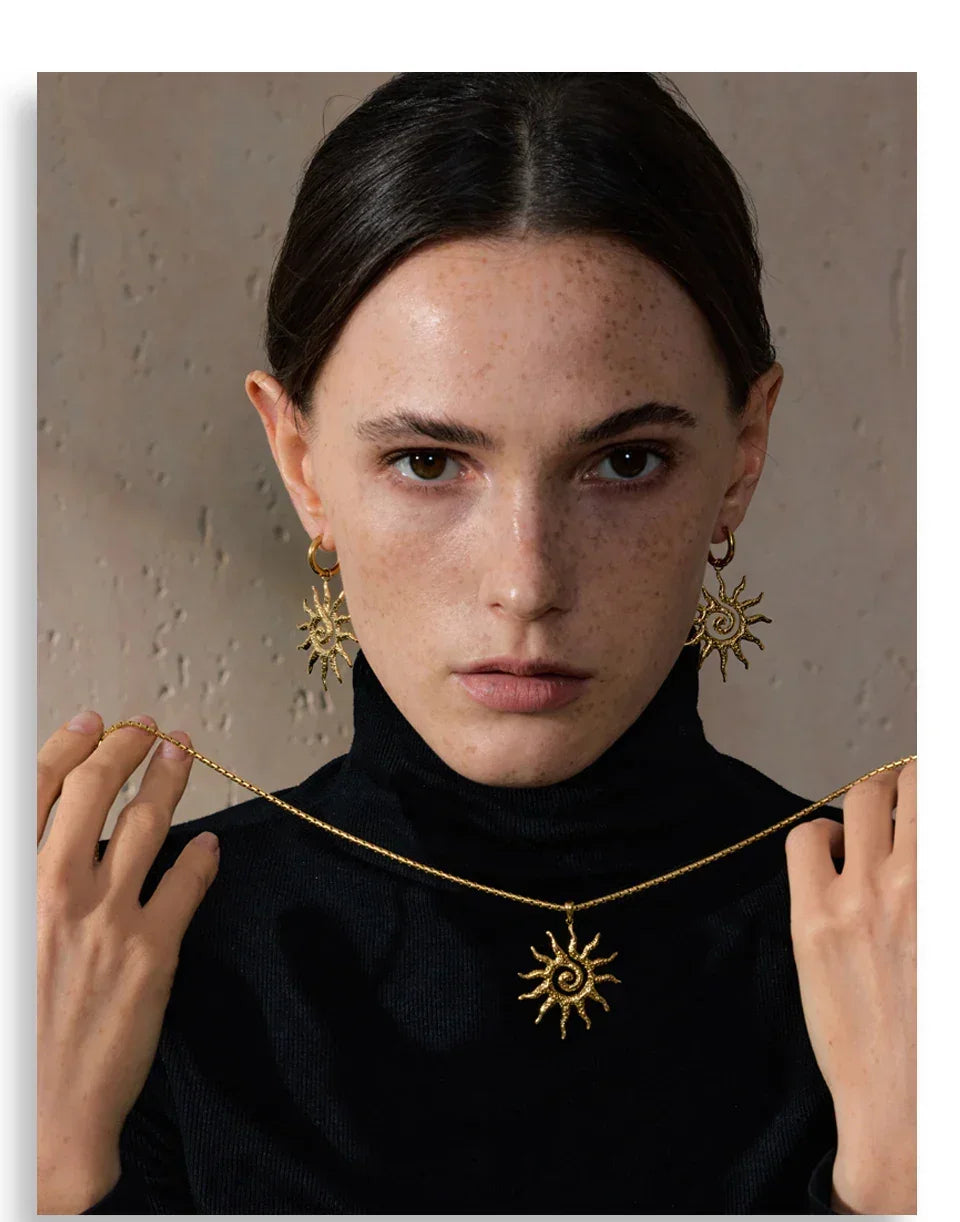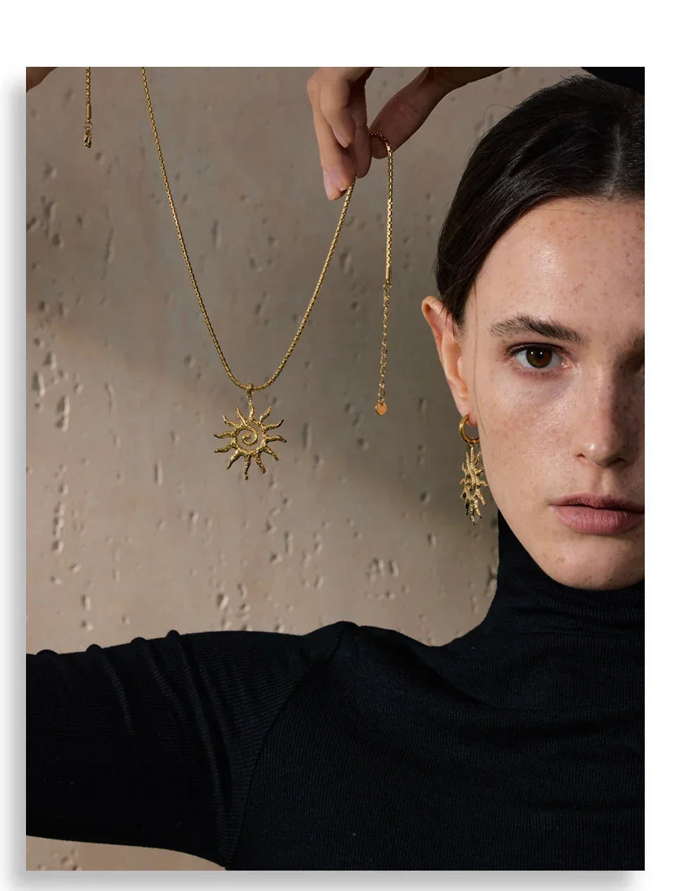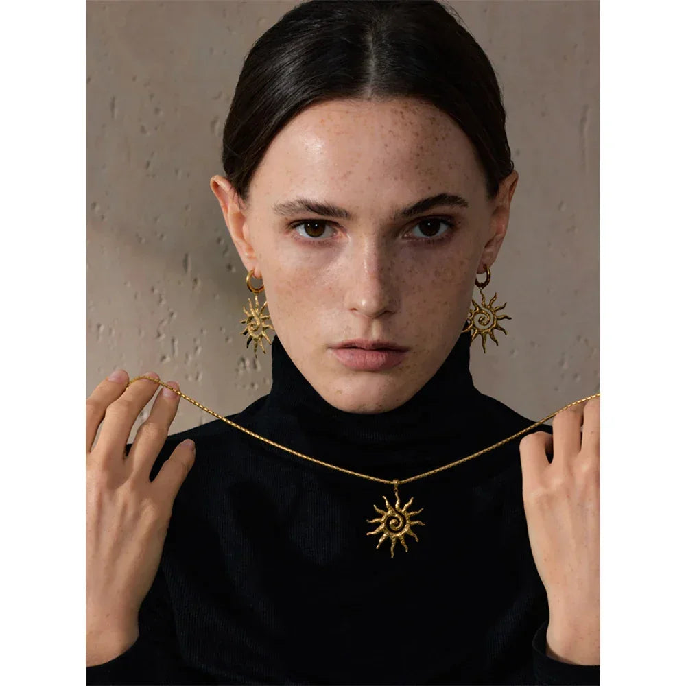 Infuse your day with radiant optimism. The Sunbeam Kiss Set features a delicate sun drop necklace and matching hoop earrings. Crafted from tarnish-resistant stainless steel, this popular set offers a timeless, cheerful charm. Carry a spark of joy with you.