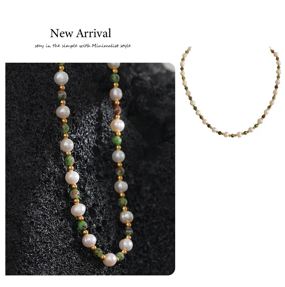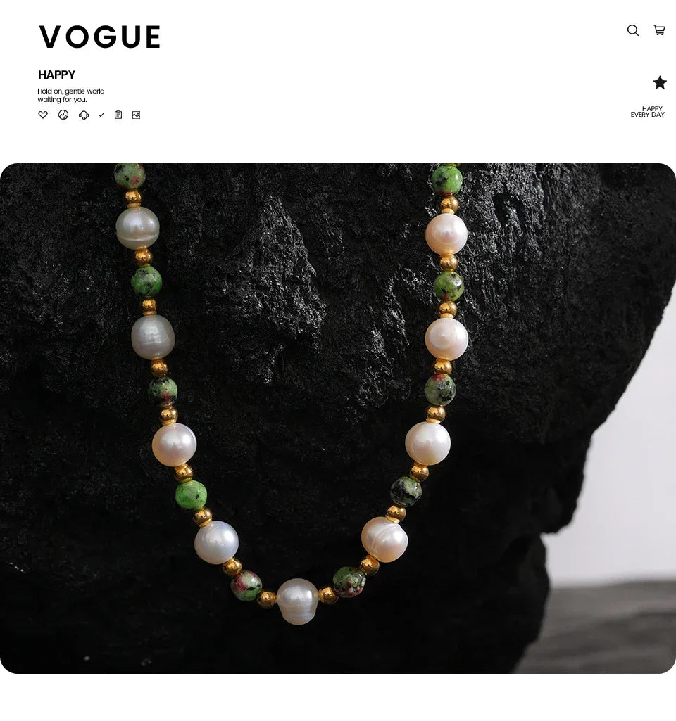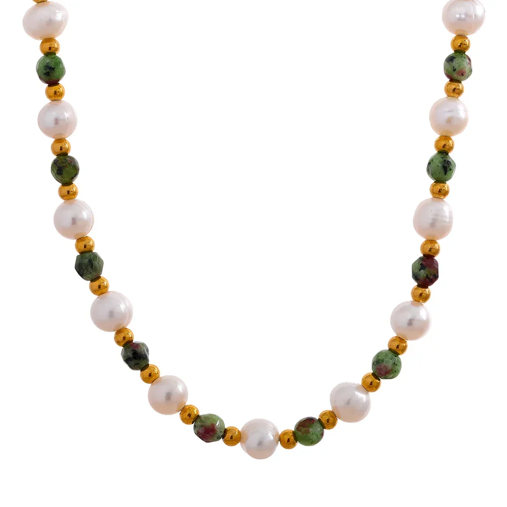 Preserve the good vibes of your necklace effortlessly. Crafted from stainless steel with epidote stones and pearls, symbolizing a perfect blend of healing energy and resilient design. Clean with a soft, dry cloth.