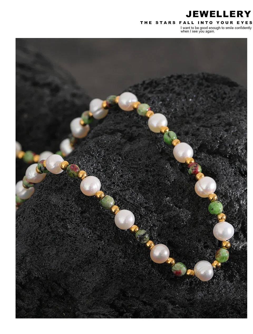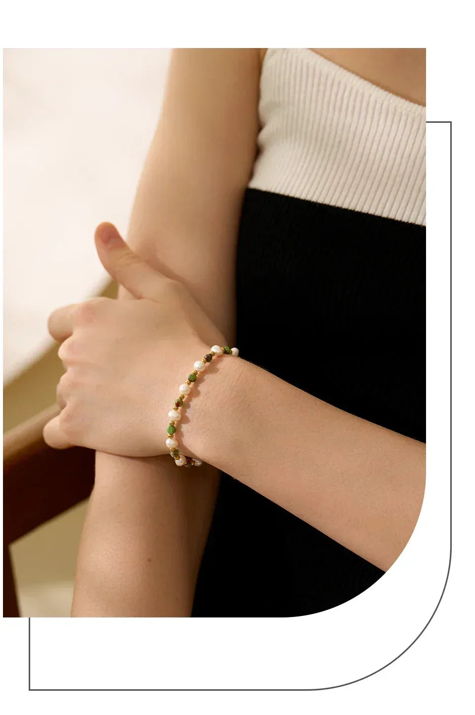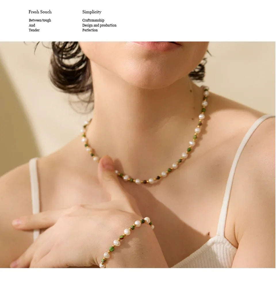 Preserve the good vibes of your necklace effortlessly. Crafted from stainless steel with epidote stones and pearls, symbolizing a perfect blend of healing energy and resilient design. Clean with a soft, dry cloth.