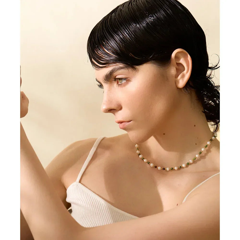 We meticulously hand-string each green epidote stone and freshwater pearl, creating a harmonious and tactile strand. The necklace is crafted from hypoallergenic stainless steel, ensuring a durable and tarnish-resistant piece that feels both healing and luxurious.