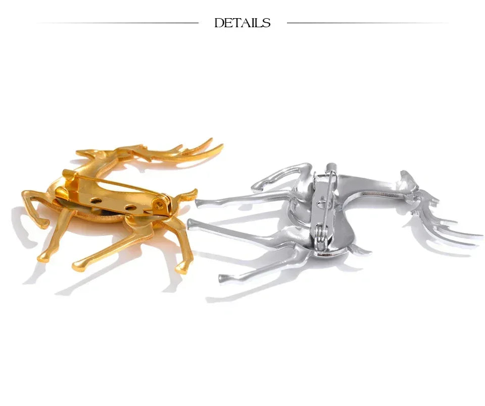 The intricate deer silhouette is crafted from durable stainless steel with a luxurious 18K PVD coating. This piece is waterproof and tarnish-resistant for lasting wear. Meticulously finished with a secure pin clasp, it is made for seasonal celebrations and enduring style.