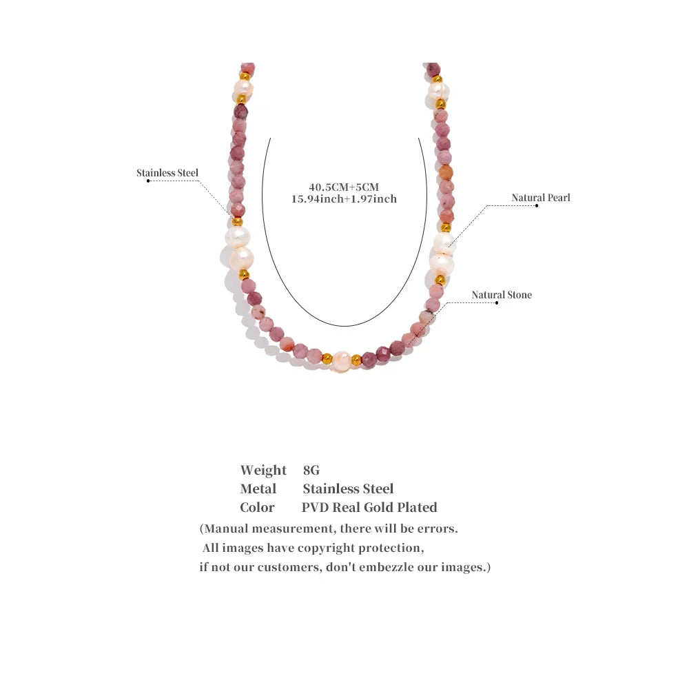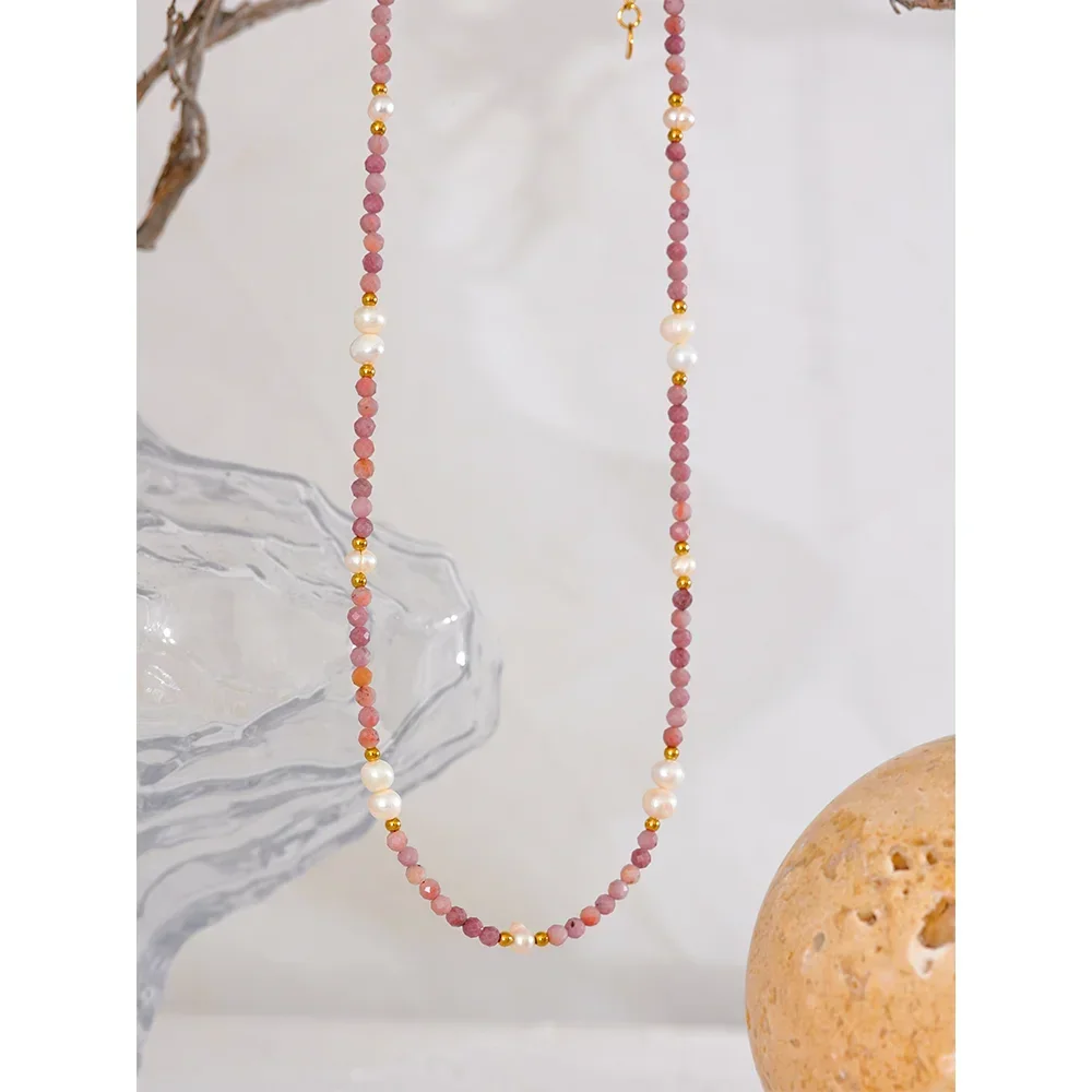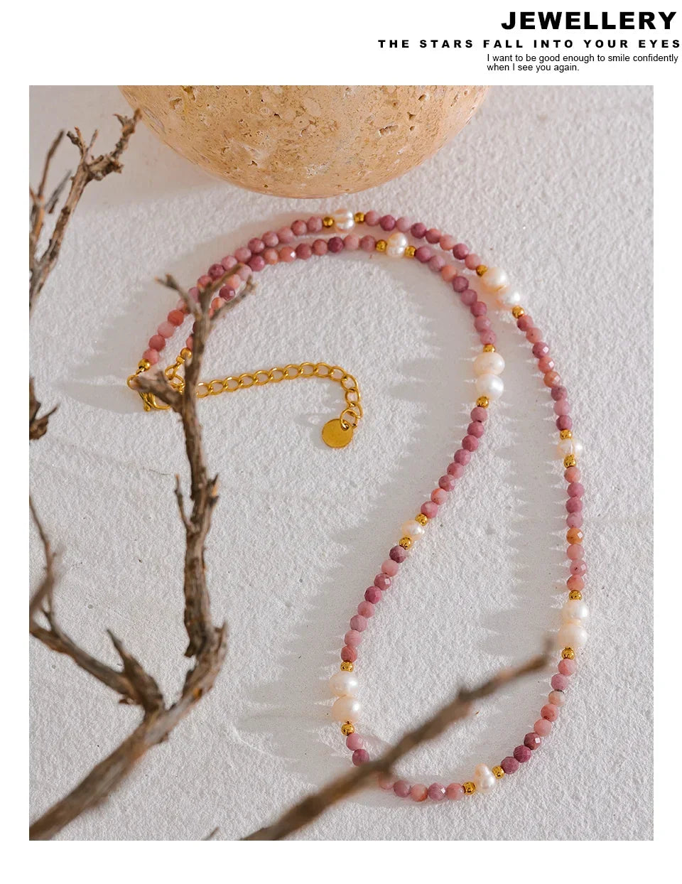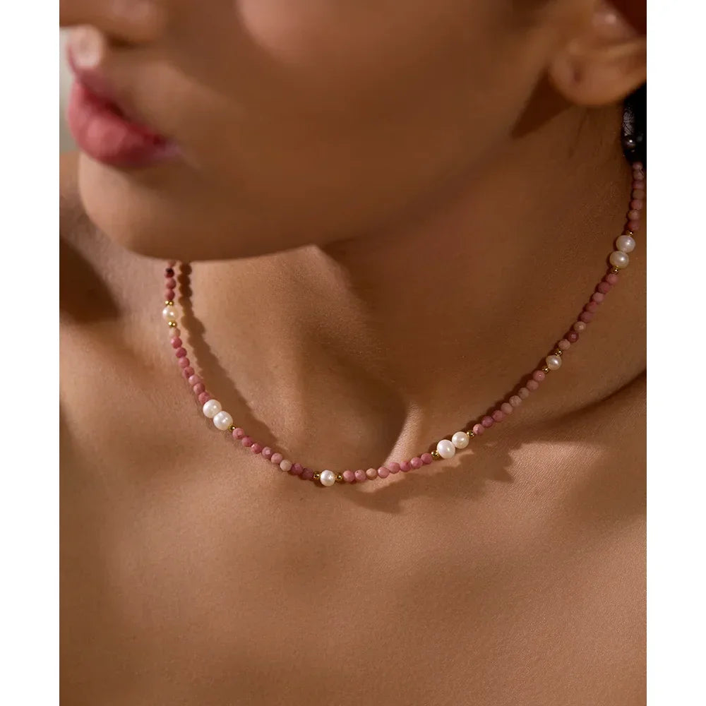 Adorn yourself with a gentle serenade of whispering affection. This trendy necklace pairs a soft pink rhodochrosite stone with a luminous freshwater pearl. Handmade from waterproof stainless steel, it’s a delicate and meaningful piece for the modern woman. Wear your tender elegance.