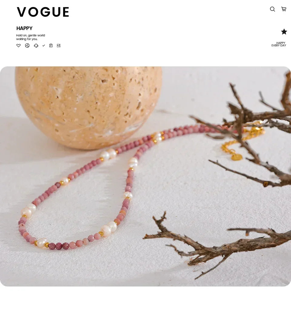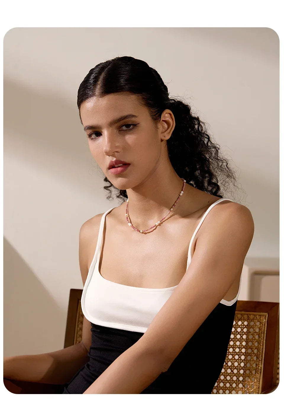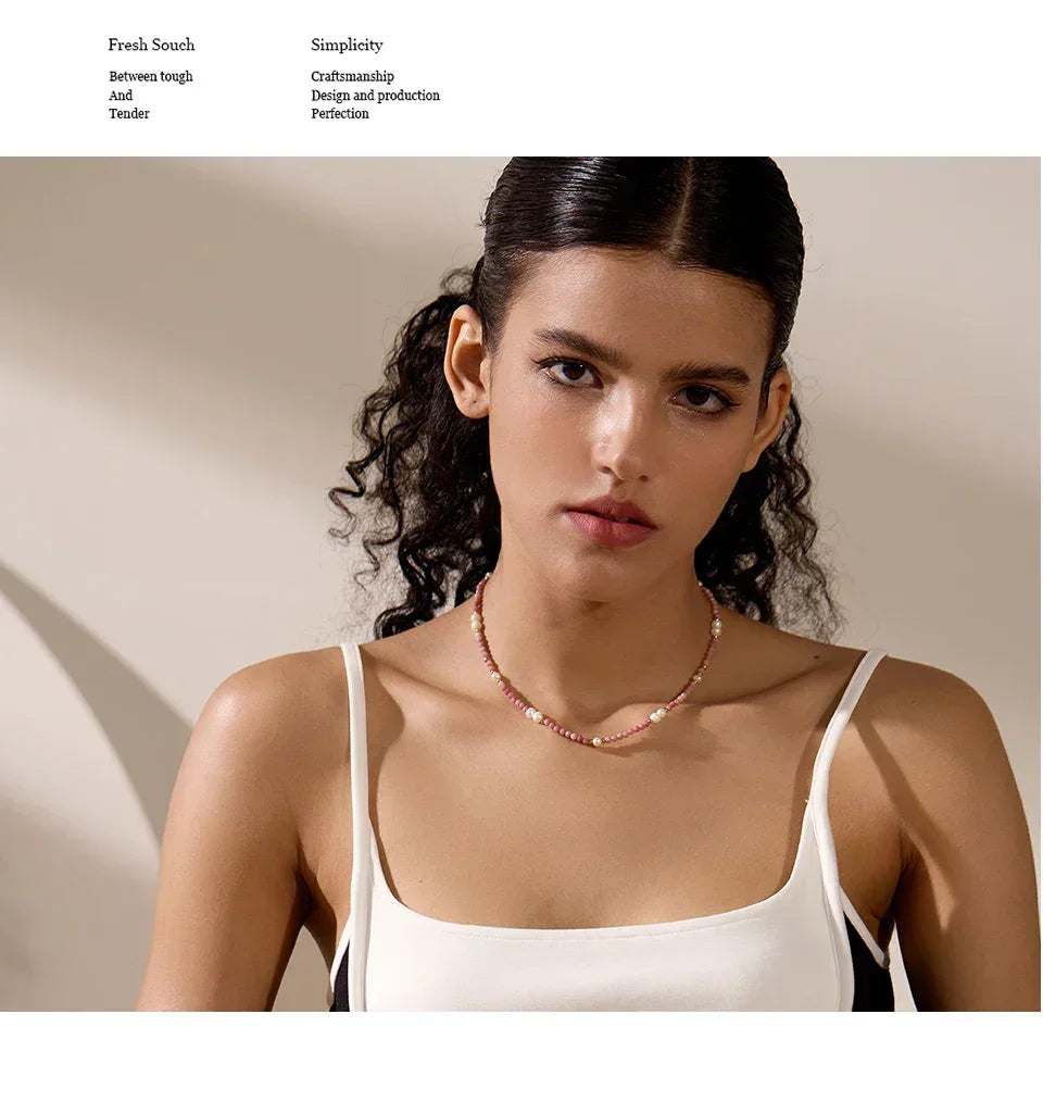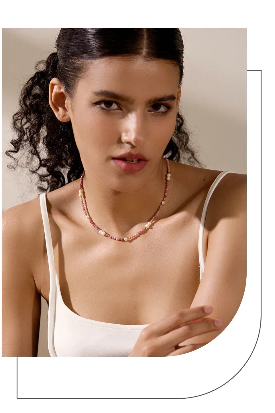 Adorn yourself with a gentle serenade of whispering affection. This trendy necklace pairs a soft pink rhodochrosite stone with a luminous freshwater pearl. Handmade from waterproof stainless steel, it’s a delicate and meaningful piece for the modern woman. Wear your tender elegance.