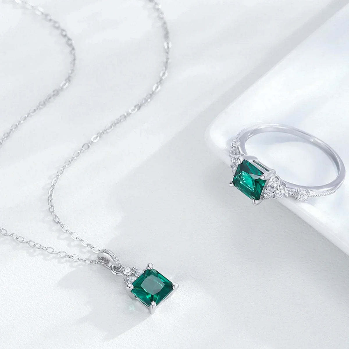 Sublimez votre élégance avec la parure Emerald Grace, une parure époustouflante en argent sterling 925 ornée de zircons carrés verts lumineux. Conçue pour une sophistication moderne, cette parure capture l'essence d'une beauté intemporelle. Idéale pour des fiançailles, des anniversaires ou des occasions spéciales, elle confère un charme royal à chacune de vos tenues.