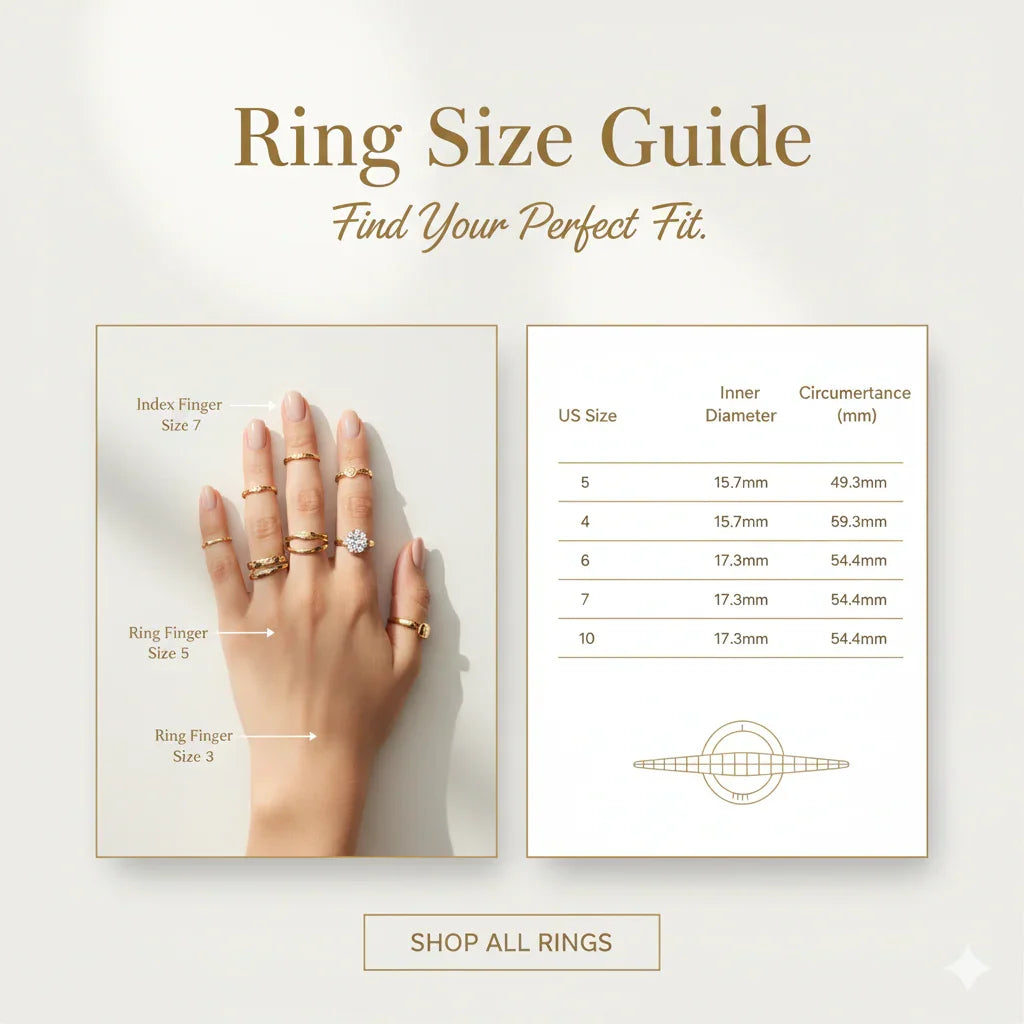 Easily and practically find your ring size with this handy chart. Simply measure the larger portion of the finger you wish using a piece of string or paper, and compare the width to the circumference of the corresponding ring size (in mm).